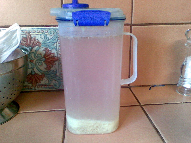 Nourishing Traditions, I grated lots of ginger. In a jar I put 1.5 cups of rainwater, 2 teaspoons of ginger and 2 teaspoons of white sugar, put the lid on and left it on the bench. I added 2 teaspoons each of ginger and sugar every morning for a week. After a few days I could see bubbles forming (that was an exciting start to the day!).
